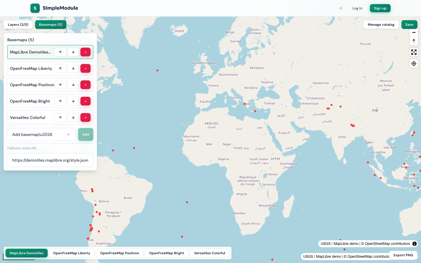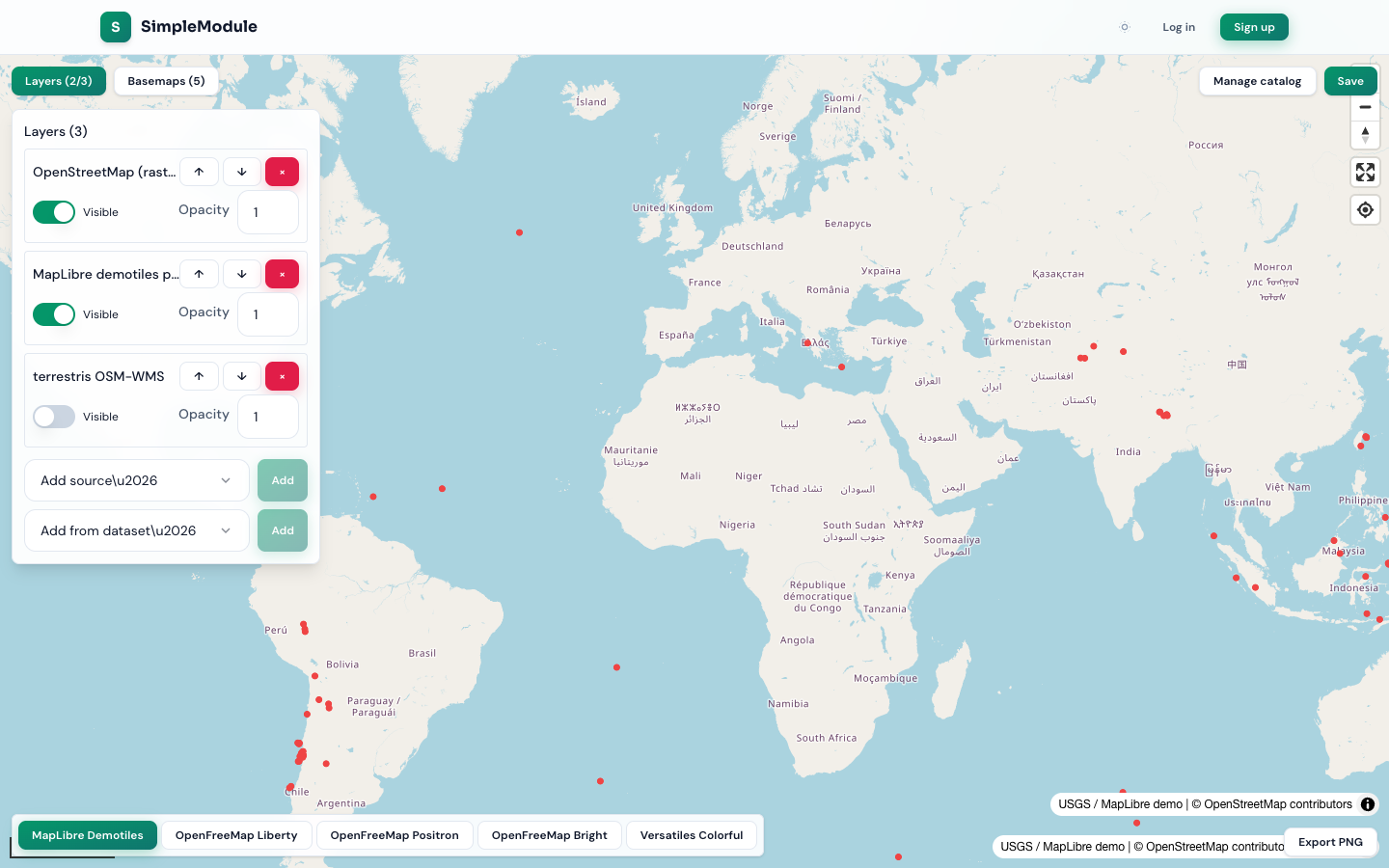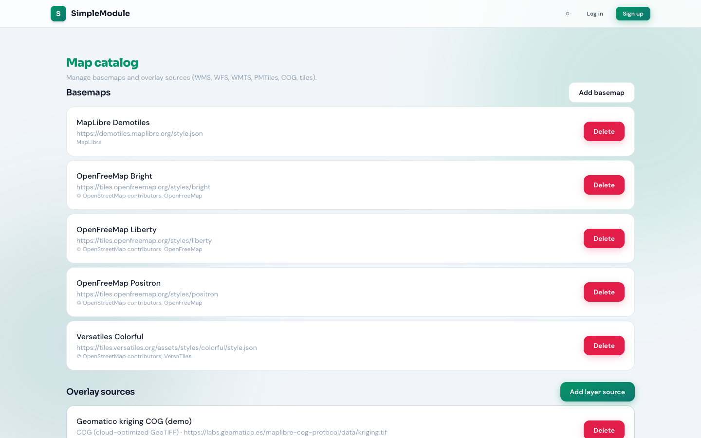 Screenshots — redesigned full-screen mapAll screenshots verified to show visible map tiles rendering correctly after the layout fix. 1. Default map — full-screen with all controls visible2. Layers floating panel (expanded from top-left button)3. Basemaps floating panel with reorder, delete, add, and fallback URL4. Basemap switched to OpenFreeMap Liberty (detailed vector tiles)5. Layer visibility toggled off (OSM raster hidden, only earthquake points visible)6. Layer removed (terrestris WMS deleted, 2 layers remain)7. Catalog management page |