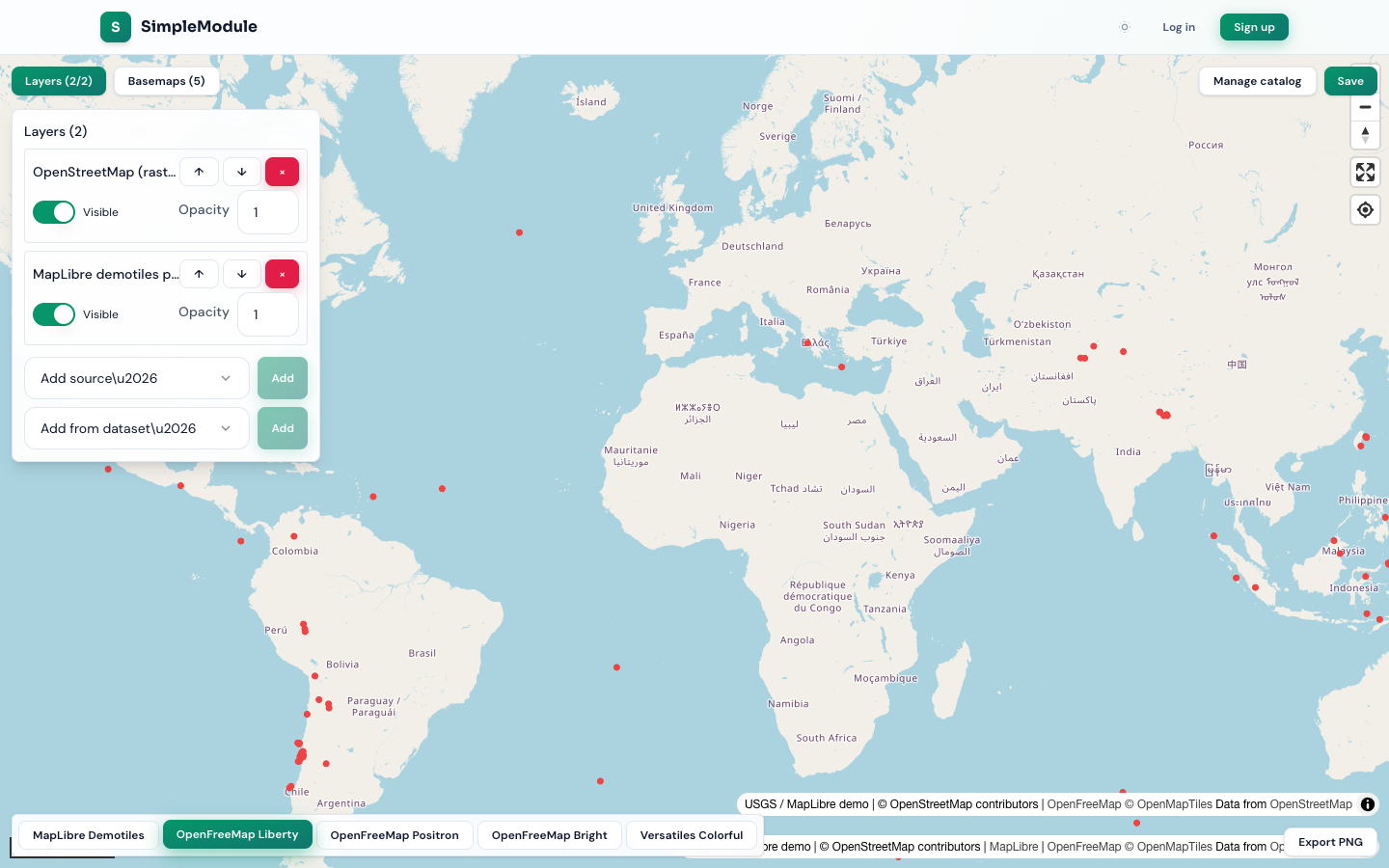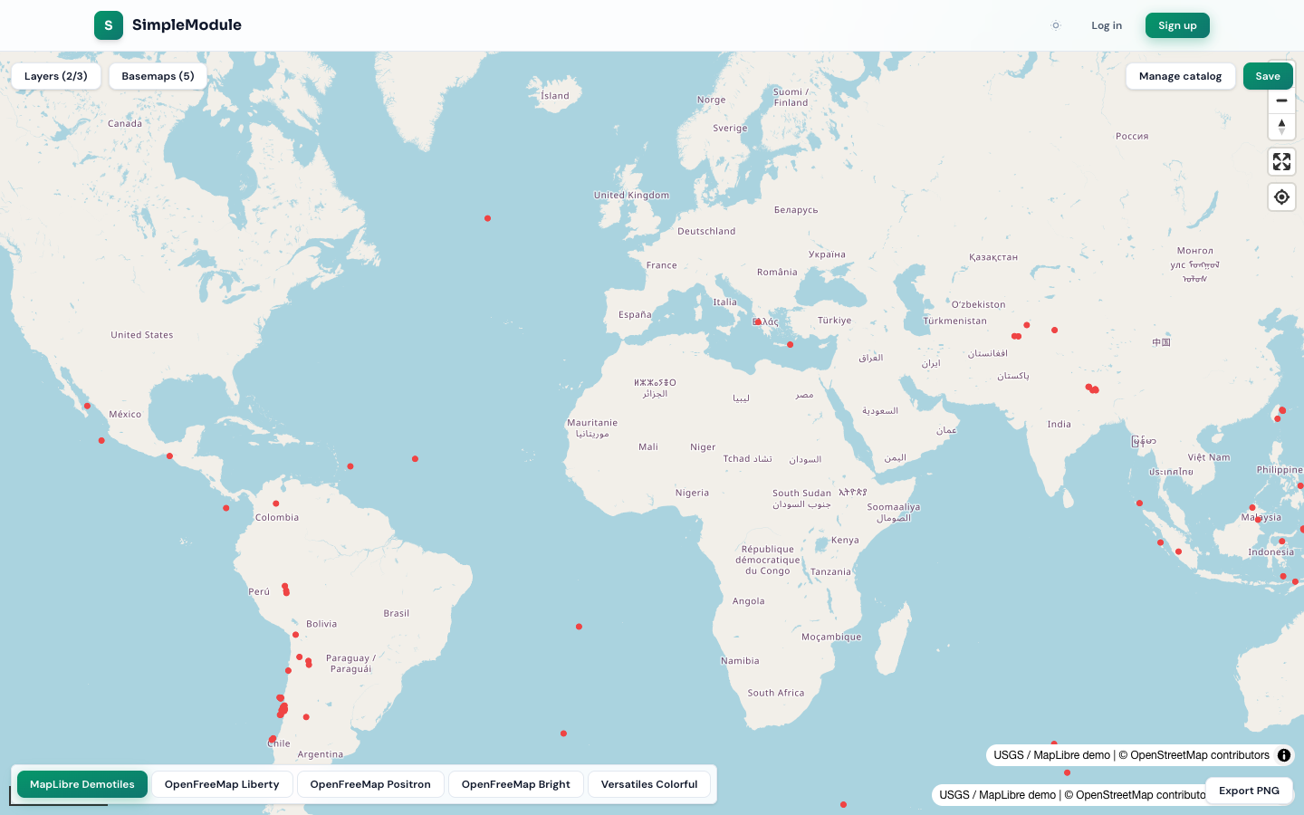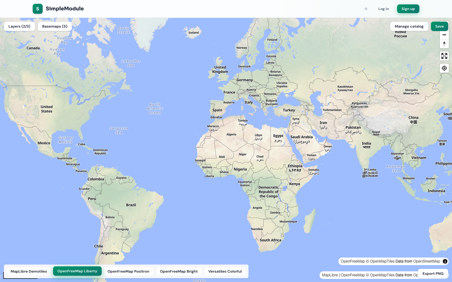 Screenshots — redesigned full-screen mapAll screenshots verified to show visible map tiles rendering correctly after the layout fix. 1. Default map — full-screen with all controls visible2. Layers floating panel (expanded from top-left button)3. Basemaps floating panel with reorder, delete, add, and fallback URL4. Basemap switched to OpenFreeMap Liberty (detailed vector tiles)5. Layer visibility toggled off (OSM raster hidden, only earthquake points visible)6. Layer removed (terrestris WMS deleted, 2 layers remain)7. Catalog management page |