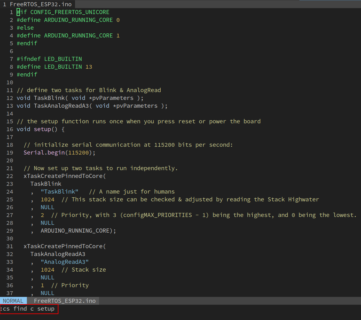 Now you can begin code tracing. For example, we can use:cs find c setupto investigate how the task is created and where is the setup() be called at the beginning of arduino-esp32. In addition to that, we can useCtrl-]andCtrl-tto jump between tags.