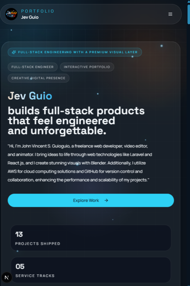 Frontend → API Layer → Backend Logic → Database → Deployment → ScalingI’m John Vincent S. Guioguio (Jev), a Full-Stack Software Engineer and Creative Technologist building production-grade systems and digital experiences.